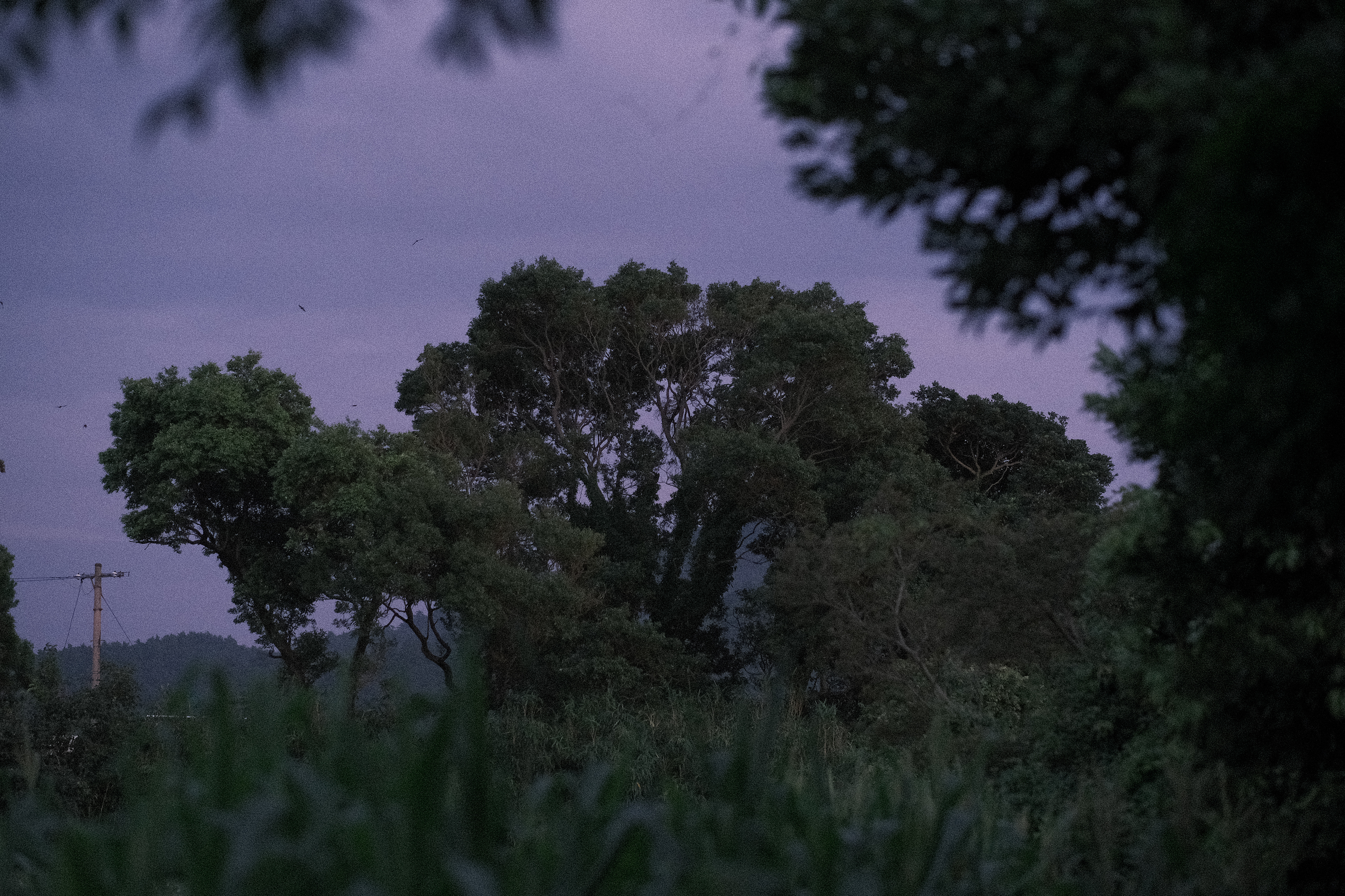 Le monde passe le temps trop vite. Le mur de l'immeuble d'en face qui brille d'or au soleil couchant est si joli que Jayne et moi allons nous promener. Cela fait 10 jours que je suis venu à Jeju, mais aujourd'hui c'est nos première marche. C'est un quartier très calme. C'est tellement silencieux que j'entends les pas du chat. Après une dizaine de minutes de montée, nous arrivons sur un terrain plat. Alors que je change de direction et que je marche, j'entends le crépitement d'une radio au loin. Cela ressemble au bruit des vagues qui s'écrasent. Ou cela ressemble au bruit d'ondes déferlantes provenant d'une radio cassée. En m'approchant un peu plus, je vois des oiseaux gazouiller dans les arbres à travers le champ. Les branches et les feuilles des arbres légèrement couvertes par le bâtiment remplissent l'air de manière étanche, et comme si les parties non remplies étaient remplies d'innombrables oiseaux. Il ressemble à un grand arbre que Totoro a rapidement fait pousser dans le film de Hayao Miyazaki, "Mon voisin Totoro".